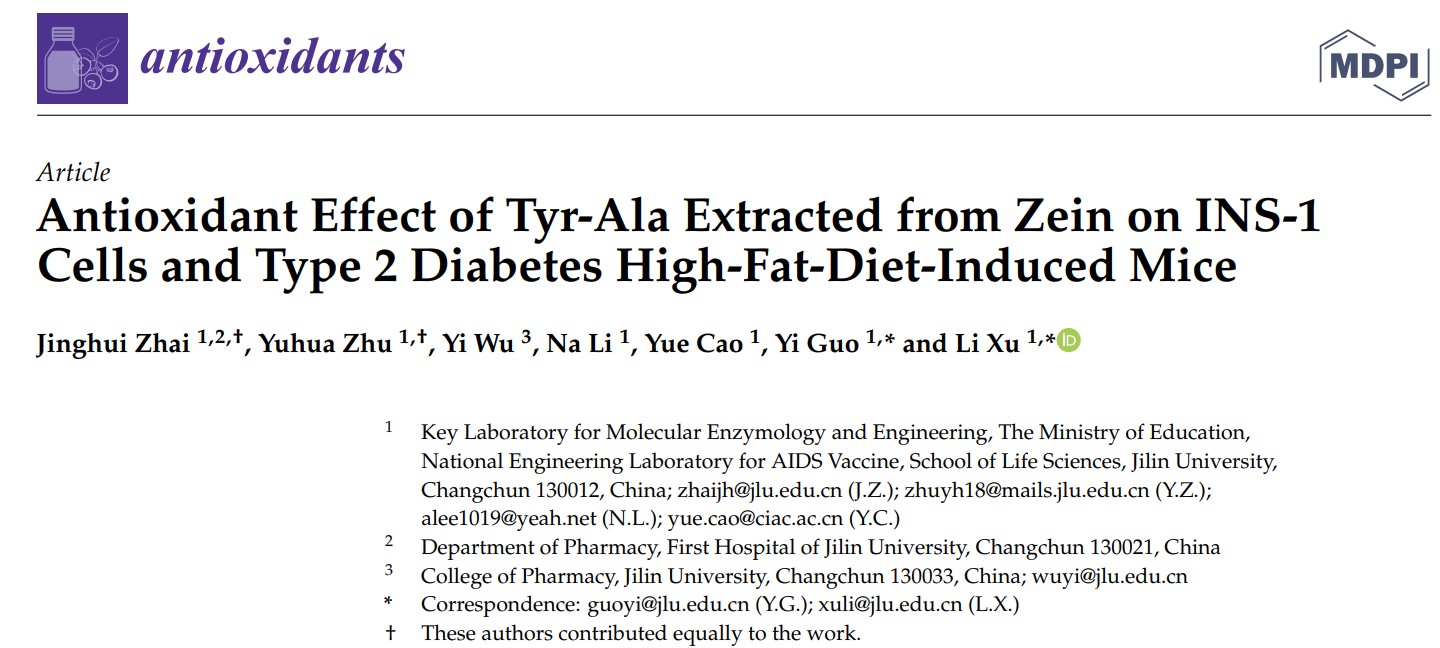 2022年6月2日,太阳成集团tyc徐力教授团队在《Antioxidants》发表小分子生物活性肽调节胰岛素分泌研究成果(Antioxidant Effect of Tyr-Ala Extracted from Zein on INS-1 Cells and Type 2 Diabetes High-Fat-Diet-Induced Mice, Antioxidants 2022, 11(6), 1111)。