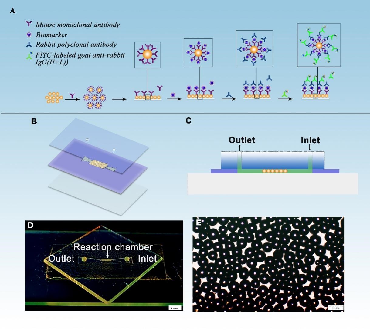 (A)微流控芯片检测原理;(B)和(C)芯片设计图;(D)芯片实物图;(E)显微镜下抗体微珠填充效果