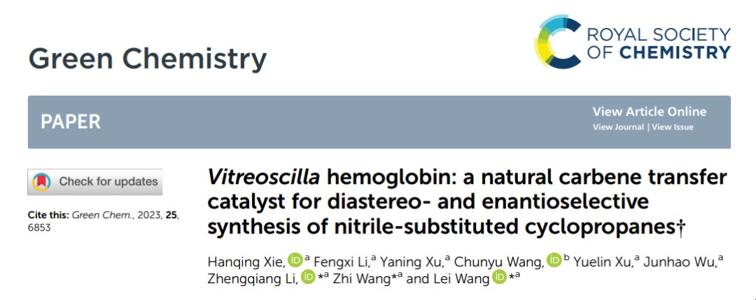通过对血红蛋白结构和催化机制的进一步理解,课题组以血红蛋白具有的卡宾转移酶活力为基础,探索其在手性合成中的应用,结合分子对接技术多角度分析催化机制,以“Vitreoscilla hemoglobin: A natural carbene transfer catalyst for diastereo- and enantioselective synthesis of nitrile-substituted cyclopropanes”为题,在国际权威学术期刊《Green Chemistry》(影响因子9.8,中科院分区一区)在线发表研究论文。论文中报告了一种对环境友好的策略,将原位生成的重氮试剂与生物催化相结合,用于芳香烯烃的不对称环丙烷化。论文第一完成单位为太阳成集团tyc,太阳成集团tyc博士谢汉青为该论文的第一作者,太阳成集团分子酶学工程教育部重点实验室王磊、王智、李正强教授为该论文的共同通讯作者。