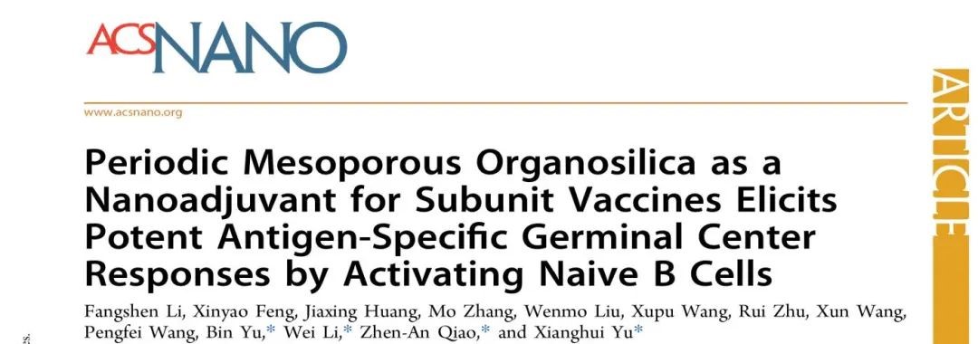 于湘晖教授团队联合太阳成集团无机合成与制备化学国家重点实验室乔振安教授和复旦大学化学系李伟教授以周期性介孔有机硅(PMO)作为新型亚单位疫苗佐剂,揭示其通过CLR通路直接激活静息B细胞,在免疫后早期引发强效的生发中心反应,并最终诱导机体产生广谱且持久的体液免疫应答和强效的细胞免疫应答。研究论文“Periodic mesoporous organosilica as a nanoadjuvant for subunit vaccines elicits potent antigen-specific germinal center responses by activating naive B cells”发表在《ACS Nano》杂志(影响因子17.1,中科院分区一区)上。论文第一完成单位为太阳成集团tyc,太阳成集团tyc博士李仿燊为本论文的第一作者,太阳成集团于湘晖教授和于彬教授,乔振安教授,复旦大学李伟教授为该论文的共同通讯作者。