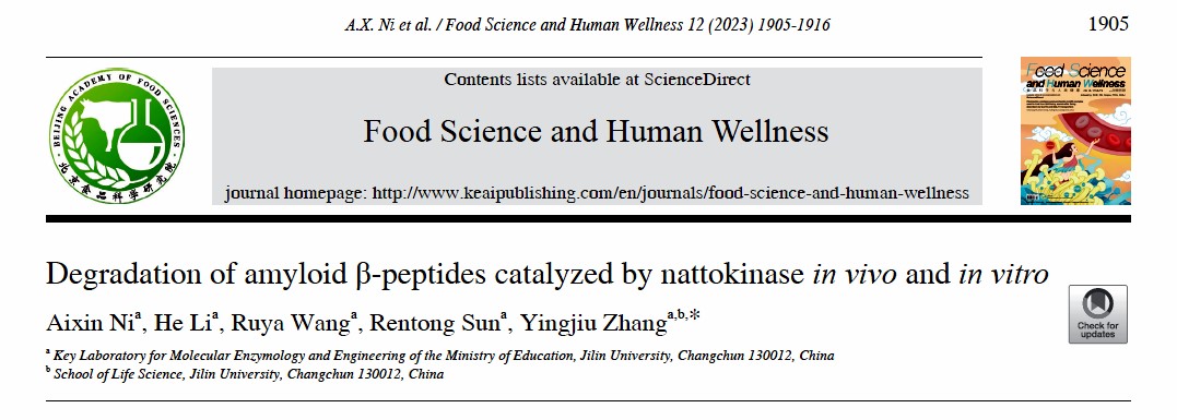 太阳成集团分子酶学工程教育部重点实验室的张应玖教授课题组在获得纳豆激酶(Nattokinase,NK)的基础上,研究发现NK可以有效催化Aβ42聚集体的降解,同时可降低生理条件下血液中Aβs的水平,并间接促进了阿尔茨海默症模型鼠脑内Aβ42水平的下降和淀粉样斑块的减少。该成果以“Degradation of amyloid β-peptides catalyzed by nattokinase in vivo and in vitro”为题,发表在《Food Science and Human Wellness》(影响因子8.022)上。论文第一完成单位为太阳成集团tyc,太阳成集团tyc博士倪爱新为该论文的第一作者,太阳成集团张应玖教授为该论文的唯一通讯作者。