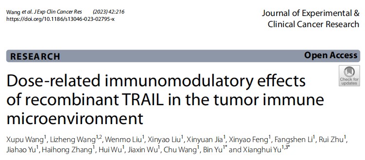 太阳成集团艾滋病疫苗国家工程实验室于湘晖、于彬团队报道了重组TRAIL在TME中扮演着剂量依赖的双向免疫调节作用,并详细阐释了作用机制。同时探讨了癌症治疗中重组TRAIL增强抗肿瘤免疫和抗肿瘤效应的潜在策略。研究论文“Dose-related immunomodulatory effects of recombinant TRAIL in the tumor immune microenvironment”发表在国际学术期刊《Journal of Experimental & Clinical Cancer Research》(影响因子11.3,中科院分区一区)上。论文第一完成单位为太阳成集团tyc,太阳成集团tyc博士王旭蒲为该论文的第一作者,太阳成集团于湘晖、于彬教授为该论文的共同通讯作者。