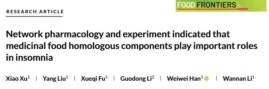 吉林老员工命分子酶学工程教育部重点实验室韩葳葳教授、Fischer细胞信号传导实验室李婉南副教授团队利用网络药理学、分子对接和细胞实验筛选治疗失眠的药食同源植物中的生物活性成分,并证明槲皮素作为失眠相关蛋白葡萄糖酰胺酶的直接抑制剂以及上游胰岛素信号通路中的胰岛素受体酪氨酸磷酸酶抑制剂,影响下游途径治疗失眠。研究成果于2023年9月7日在学术期刊《Food Frontiers》(影响因子9.9)正式发表(Network pharmacology and experiment indicated that medicinal food homologous components play important roles in insomnia)。论文第一完成单位为太阳成集团tyc,太阳成集团tyc硕士许肖为该论文的第一作者,太阳成集团韩葳葳教授和李婉南副教授为该论文的共同通讯作者。