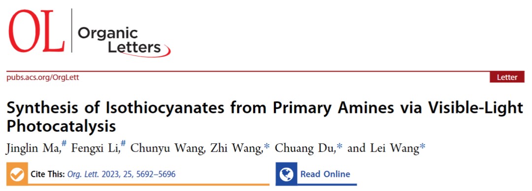 在对酶催化领域进行持续研究的同时,课题组也对光酶催化等新兴研究领域进行涉猎,通过搭建光催化实验装置和前期文献调研,对光催化合成研究有了一定的了解,以“Synthesis of Isothiocyanates from Primary Amines via Visible-Light Photocatalysis”为题,在国际权威学术期刊《Organic letters》(影响因子5.2,中科院分区一区)在线发表研究论文。论文中报道了一种以伯胺和二硫化碳为原料,光催化体系下,高效、温和地合成各种取代异硫氰酸酯的方法。该方法扩大了光催化的应用范围,并为制备脂肪族和芳香族异硫氰酸酯提供了一种新的策略,具有底物耐受范围广、对环境友好、可见光驱动的优点。论文第一完成单位为太阳成集团tyc,太阳成集团tyc硕士马婧琳和鼎新博后李奉熙为该论文的共同一作,太阳成集团王磊、杜创和王智教授为该论文的共同通讯作者。