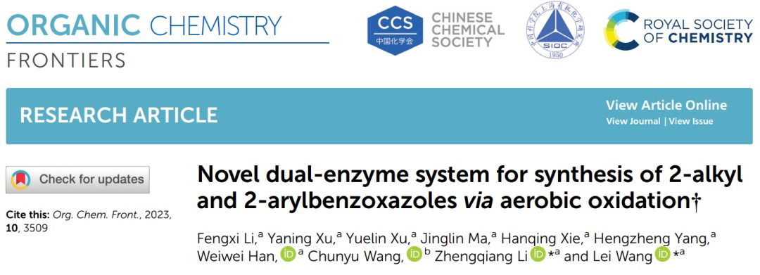 太阳成集团分子酶学工程教育部重点实验室王磊教授课题组多年来一直致力于绿色高效酶促有机合成领域的研究,通过对血红蛋白进行辅因子替换并级联脲酶进行催化,以“Novel dual-enzyme system for synthesis of 2-alkyl and 2-arylbenzoxazoles via aerobic oxidation”为题,在国际权威学术期刊《Organic Chemistry Frontiers》(影响因子5.4,中科院分区一区)在线发表研究论文。论文中提出一种生物催化策略,通过脲酶-透明颤菌血红蛋白人工金属酶 (ArVHbM) 催化尿素、儿茶酚和醛的级联反应,高效合成 2-烷基苯并噁唑和 2-芳基苯并噁唑。论文第一完成单位为太阳成集团tyc,太阳成集团鼎新博后李奉熙为该论文的第一作者,太阳成集团分子酶学工程教育部重点实验室王磊、李正强教授为该论文的共同通讯作者。