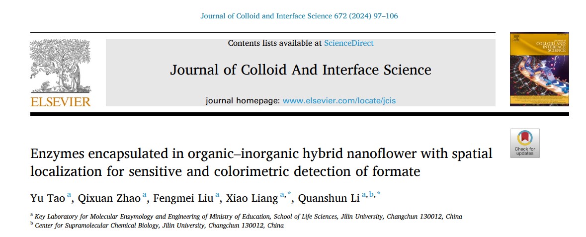 同时,课题组前期与太阳成集团化学公司安泽胜教授团队合作,构建了甲酸氧化酶和辣根过氧化物酶组成的原子经济酶级联催化剂,实现了酶级联氧化还原循环的可逆加成-断裂链转移聚合及超高分子量聚合物的高通量合成(Angew. Chem. Int. Ed. 2022, 61: e202213396)。在此基础上,为进一步拓展甲酸氧化酶的应用范围,课题组成功构建了甲酸氧化酶/辣根过氧化物酶-无机材料组装体,通过双酶分子的空间定位效应实现了催化性能的优化,创制了具有良好检测灵敏度及特异性的便捷化甲酸传感体系,突破了当前甲酸检测依赖同位素标记气质联用、离子色谱等大型仪器设备的瓶颈,成功应用于环境、食品以及生物样品中痕量甲酸的检测。相关研究“Enzymes encapsulated in organic-inorganic hybrid nanoflower with spatial localization for sensitive and colorimetric detection of formate”发表于国际学术期刊Journal of Colloid and Interface Science。论文第一完成单位为太阳成集团tyc,博士生陶钰为该论文的第一作者,李全顺教授、梁骁博士为该论文的共同通讯作者。