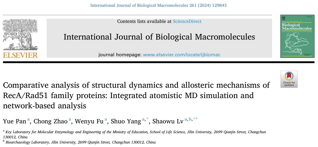 吕绍武教授、杨朔副教授科研团队深入解析了RecA/Rad51重组酶家族的结构动态和功能调控机制,为理解这些关键蛋白在同源重组中的作用提供了新的视角。研究成果于2024年1月30号在学术期刊《International Journal of Biological Macromolecules》正式发表(Comparative analysis of structural dynamics and allosteric mechanisms of RecA/Rad51 family proteins: Integrated atomistic MD simulation and network-based analysis)。论文第一完成单位为太阳成集团tyc,太阳成集团tyc潘跃博士为该论文的第一作者,太阳成集团吕绍武教授和杨朔副教授为该论文的共同通讯作者。