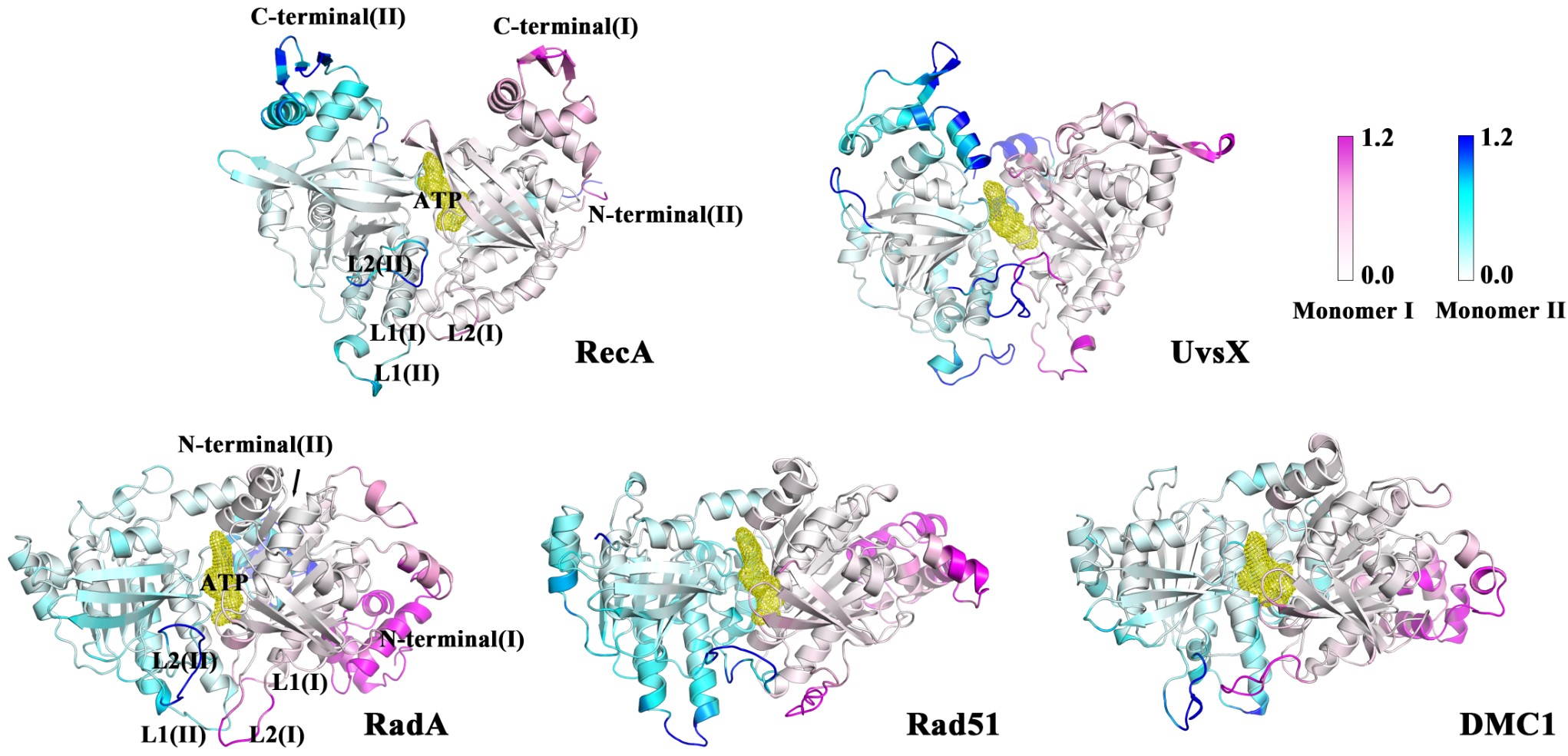 同源重组在双链断裂修复、停滞复制叉修复和减数分裂中起关键作用。RecA/Rad51家族重组酶催化同源重组过程中发生的DNA链入侵反应。此家族蛋白之间的序列差异较大,但它们通常能够折叠成高度相似的三维结构,并发挥着保守的同源重组活性。然而此家族蛋白动力学机制的分子细节,特别是在残基水平上的机制仍然不清楚,其生物学意义背后的分子水平动态机制尚未得到充分表征。吕绍武教授和杨朔副教授课题组选取了涵盖主要生物界(原核生物、真核生物、古细菌和病毒)的5种具有代表性的RecA/Rad51重组酶家族成员,采用全原子分子动力学模拟、微扰响应扫描和蛋白质结构网络分析等多种技术,系统性地探索了各重组酶突触前丝保守的生物学意义,低序列一致性背后的分子结构和动态行为(图1)。