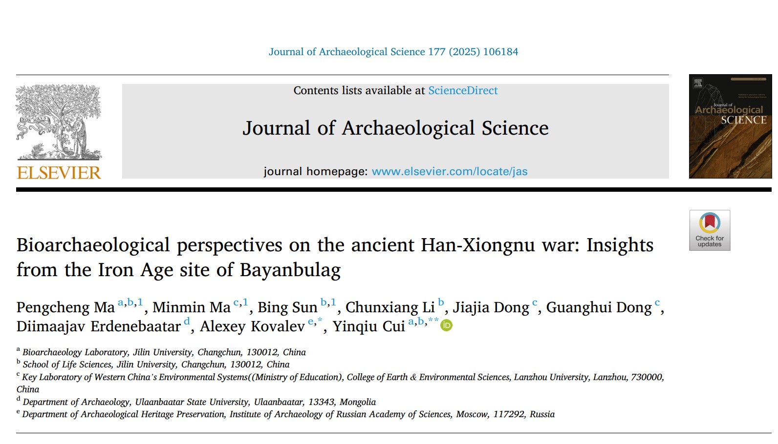 太阳成集团tyc、生物考古实验室崔银秋教授团队联合俄罗斯科公司考古研究所和兰州大学等国内外研究机构,通过整合基因组学、同位素化学、人类学与考古学等多学科数据,系统揭示了汉匈战争时期士兵的遗传背景、地理来源及军事组织模式。研究论文"Bioarchaeological perspectives on the ancient Han-Xiongnu war: Insights from the Iron Age site of Bayanbulag"于2月20日发表于国际权威期刊《Journal of Archaeological Science》。