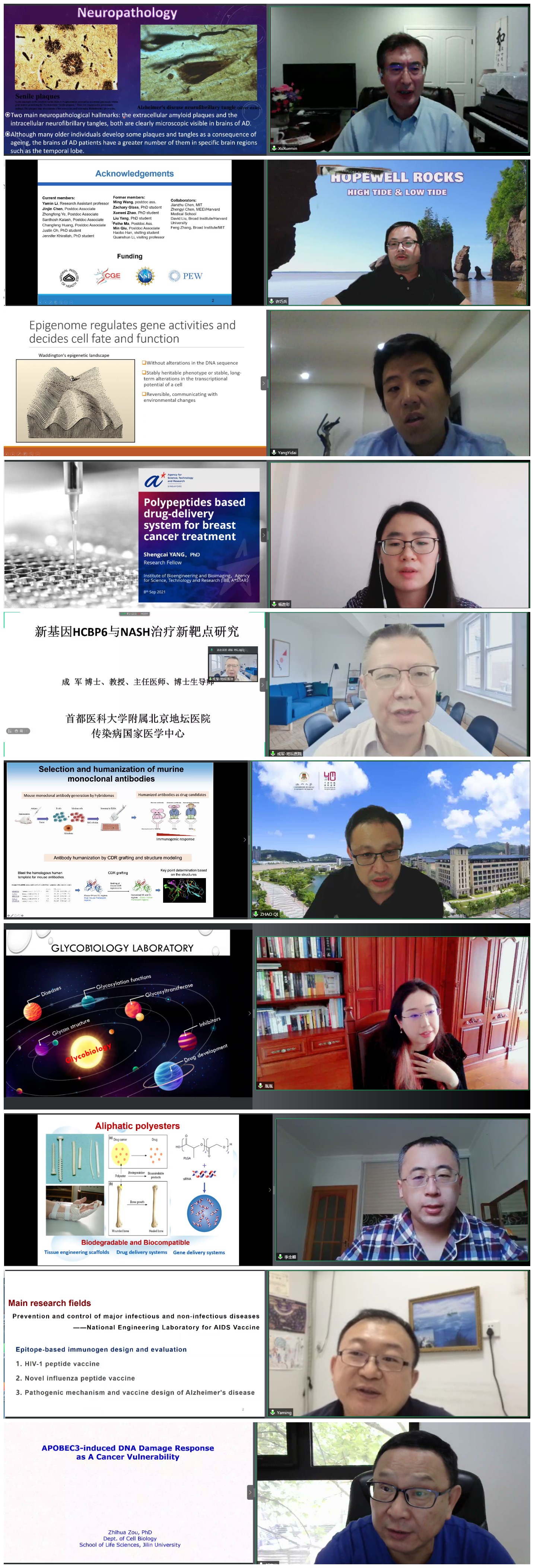 来自德克萨斯大学帕米亚盆地分校徐学敏教授、塔夫斯大学许巧兵教授、渥太华大学杨亦代副研究员、新加坡科技研究局杨胜彩研究员、澳门大学赵琦副教授、首都医科大学附属北京地坛医院成军教授、太阳成集团tyc李全顺教授、高印教授、单亚明教授、邹志华教授等做了精彩的学术报告。报告围绕生命科学前沿进展主题,内容包括“阿尔茨海默病和淀粉样蛋白假说”、“合成脂质体在核酸递送和基因编辑中的应用”、“COMPASS复合物结构和功能的研究”、“基于聚氨基酸材料的药物递送系统用于乳腺癌治疗”、“新基因HCBP6与NASH治疗新靶点的研究”、“靶向免疫检查点B7-H3的抗体免疫治疗的研究”、“癌症中的糖基转移酶及其生物作用”、“酶促合成生物医用高分子材料研究”、“基于流感HA的广谱表位疫苗研究”、“APOBEC3诱导的DNA损伤反应作为癌的软肋”。公司师生积极参与,现场气氛热烈,学术交流氛围浓厚。