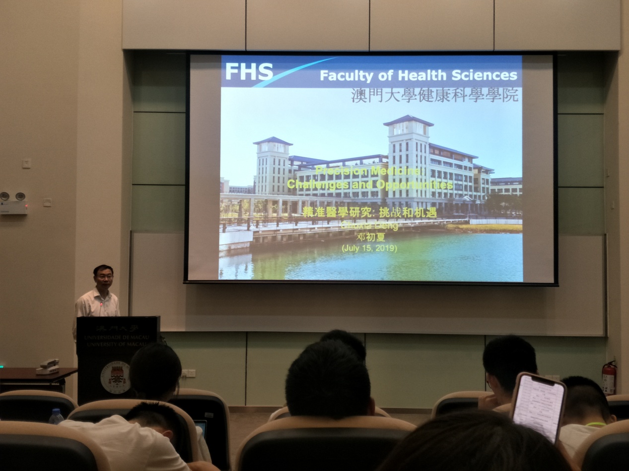 在澳门大学学习期间,主办方精心安排的生物医学讲座给大家留下了深刻的印象。邓初夏教授以“精准医学的挑战与机遇”为主题深入浅出的讲解,让同学们对精准医学领域有了更为深刻的体会,感受到量身定做的个性化治疗方案对于癌症病人生活质量改善的意义所在。徐仁和教授致力于干细胞和再生医学的研究,研究兴趣包括探索EMSCE的新型治疗应用,在各种病理条件下阐明EMSC在宿主中的命运、解决hESC衍生的同种异体移植物的免疫原性和生物安全性问题。罗茜教授主要为大家讲解了十大癌症的特征表现,如避免免疫破坏、激活侵袭和转移、肿瘤促进炎症等,此外还研究循环肿瘤细胞如何在循环中存活并获得转移能力,并针对提出不同对付癌细胞转移的策略。王山鸣教授介绍了其课题组目前进展课题,通过scRNA-Seq定义乳腺癌异质性;使用ChIA-PET和Hi-C对癌细胞进行3D染色质分析;通过图像质量细胞计数对肿瘤免疫微环境的高维分析。报告后,参会师生从不同角度提出了问题,并与教授进行了热烈的讨论和交流,现场气氛热烈,与会的广大师生受益匪浅。