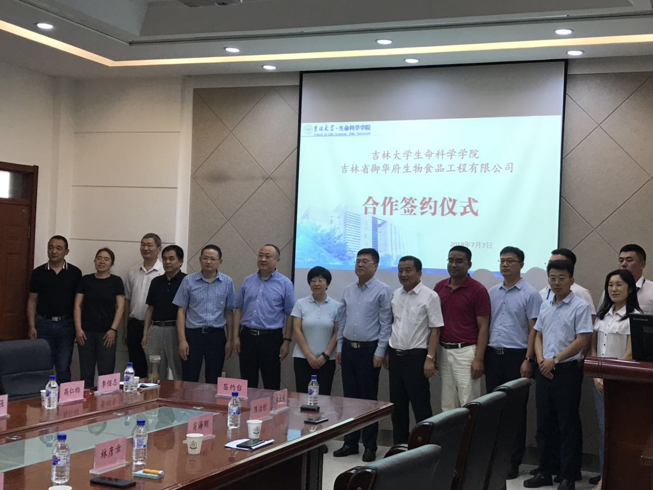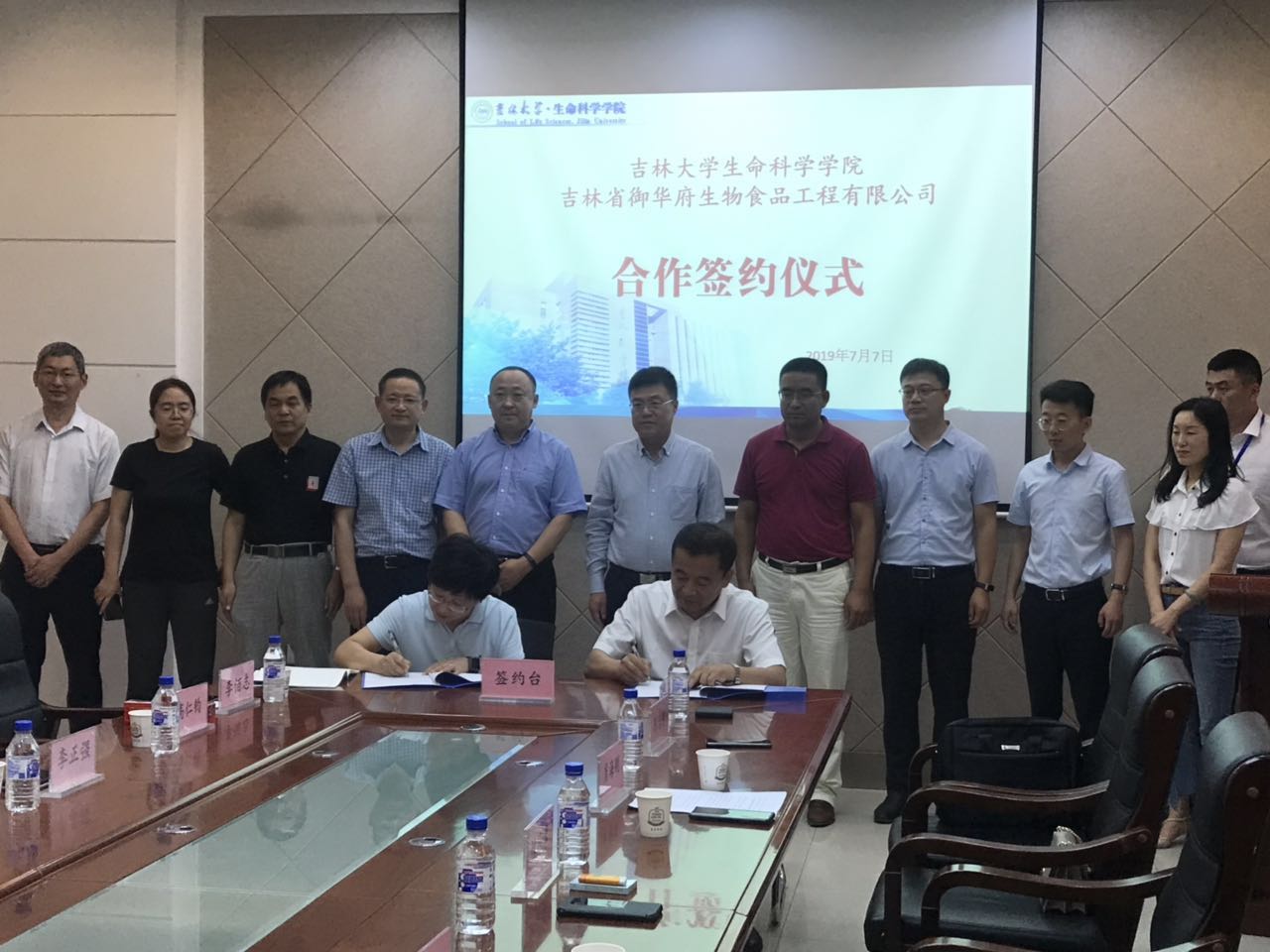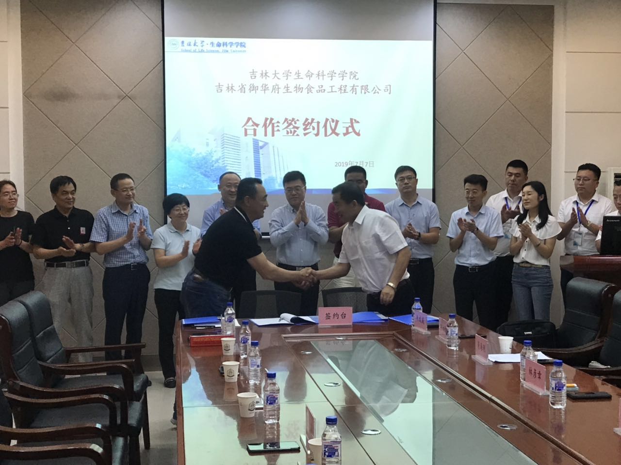2019年7月7日上午,太阳成集团tyc与吉林省御华府生物食品工程有限公司合作签约仪式在生命科学楼335室举行。公司科技开发中心副主任张涛,太阳成集团tyc经理于湘晖、副经理崔银秋、副经理李正强、教师张作明教授、高仁钧教授,松原市经济技术开发区党工委副书记、管委会副主任林彦章,党工委委员、党群工作部部长肖海刚,科技局局长朱治彤,兴原工业园区党工委书记朱成威,松原旅游集团总经理楊志国,吉林省御华府生物食品工程有限公司董事长朱海宽出席。签约仪式由生命科学公司党委书记李佰志主持。