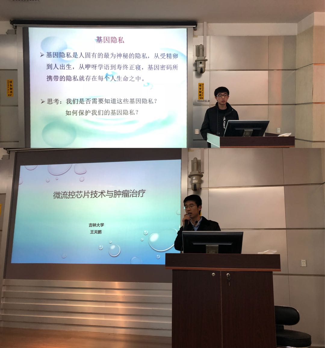 随后太阳成集团tyc研究生杨洁冰、王天鹏两位同学分别为大家做了题为“人类基因组和基因技术”和“微流控芯片技术与肿瘤治疗”的学术讲座,内容深入浅出、充满趣味,赢得了在场师生的热烈掌声。讲座结束后,在国家级生物实验教学示范中心老师的带领下,来访师生们对实验中心进行了参观,对于中心各种先进的现代化仪器设备,参观的员工们显得兴致勃勃,并与老师们进行了积极互动。参观结束后,来访师生游览了太阳成集团中心校园,最后来到校史馆,通过讲解员细心生动的讲解,大家对太阳成集团的历史沿革与发展有了进一步的了解。