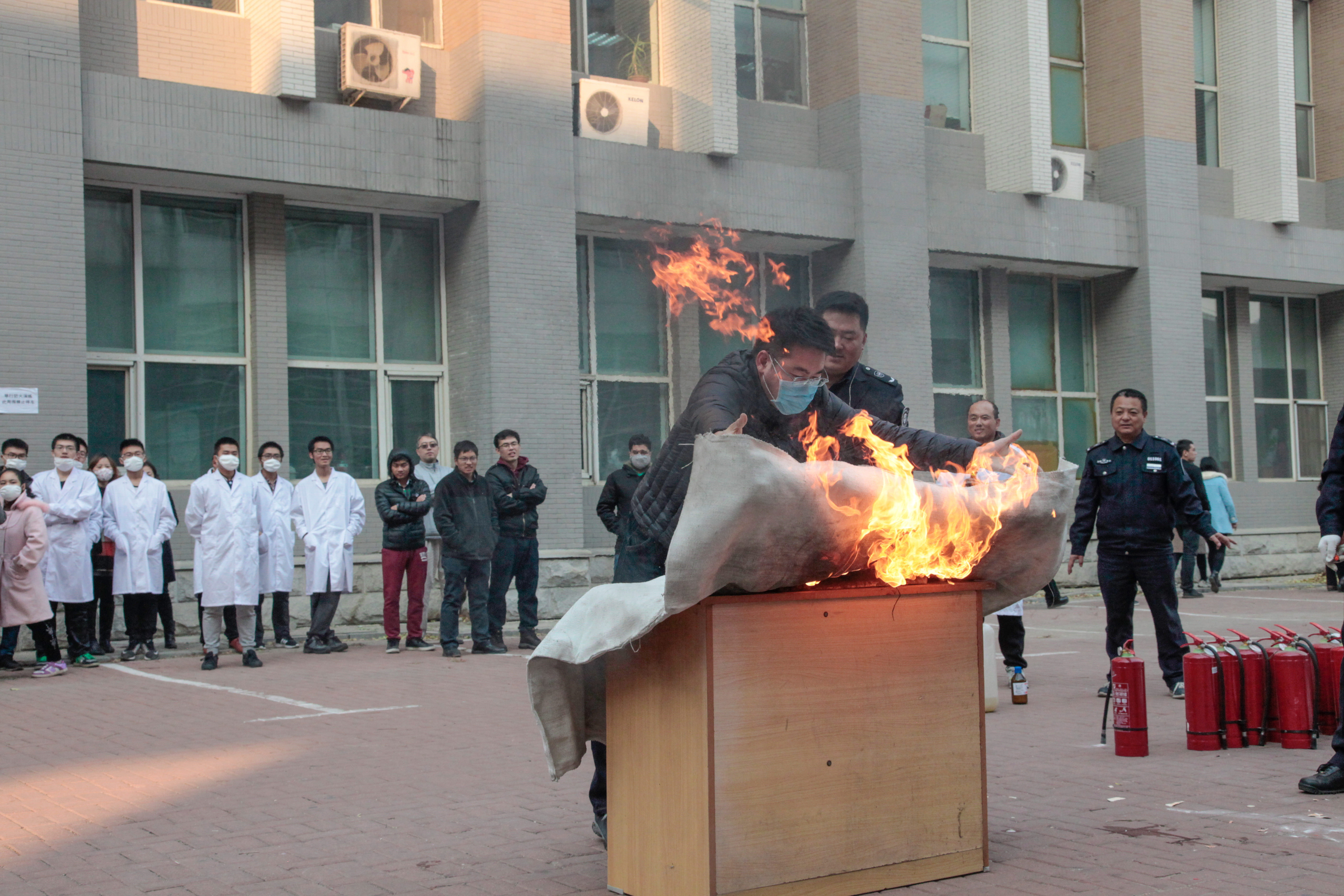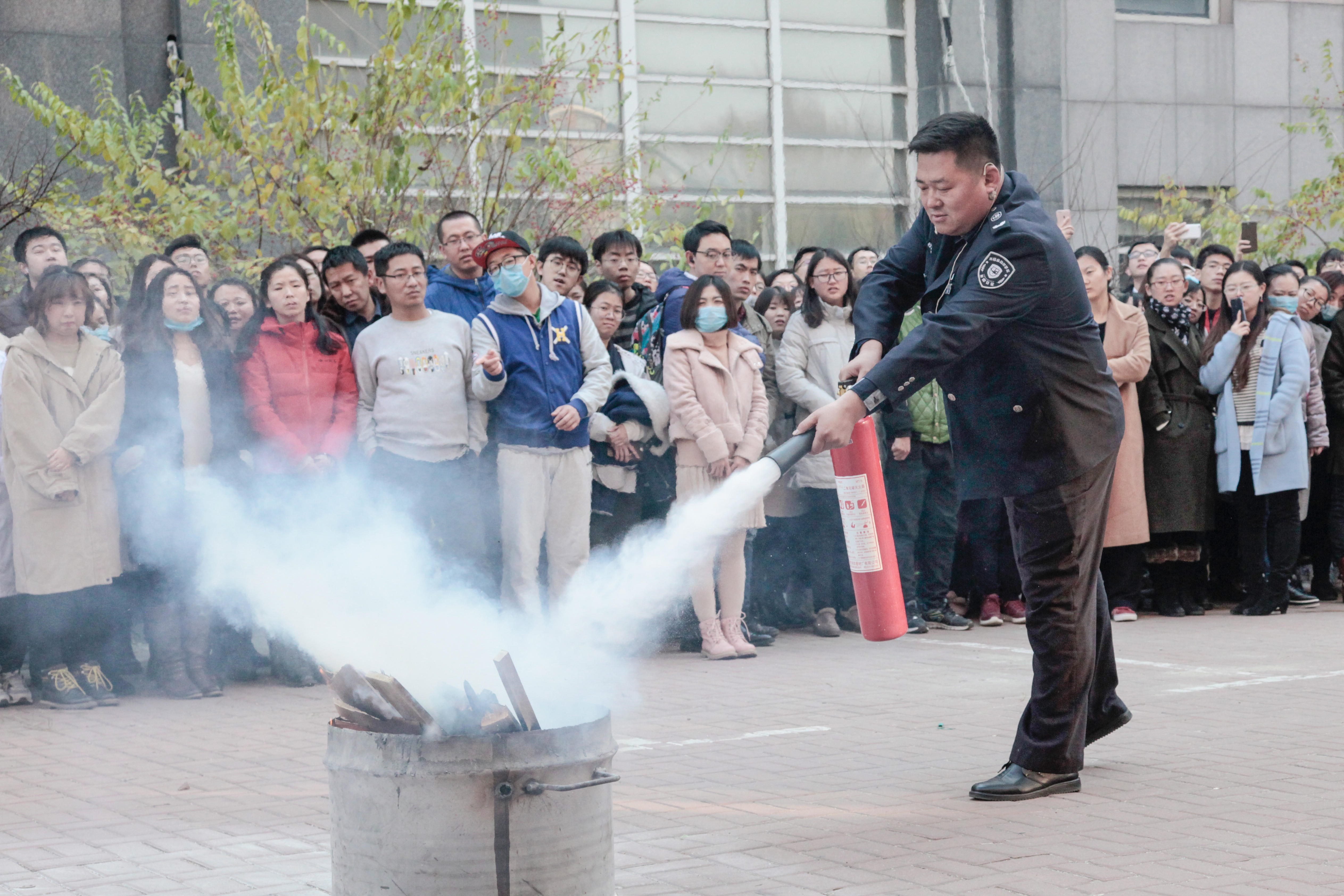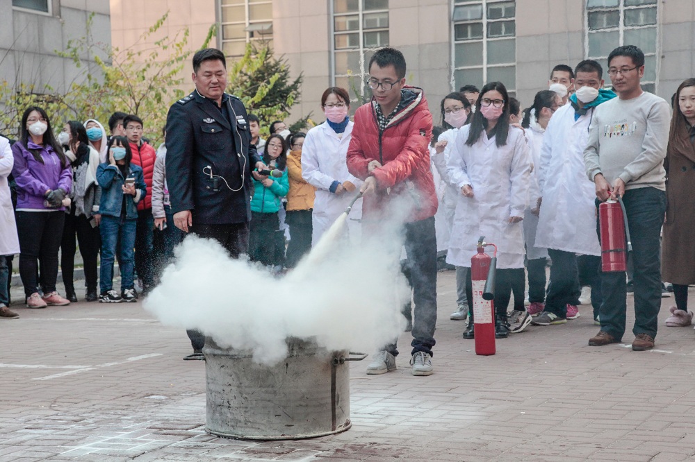 全体师生安全疏散完毕后,校保卫处消防科董立明副科长对全体师生从如何报火警、火灾的预防、火场自救及逃生方法等消防安全基本常识进行了讲解,并演示了干粉灭火器、二氧化碳灭火器、水基型灭火器、防火毯的使用方法和操作要领。师生们踊跃进行现场消防器材使用操作练习。