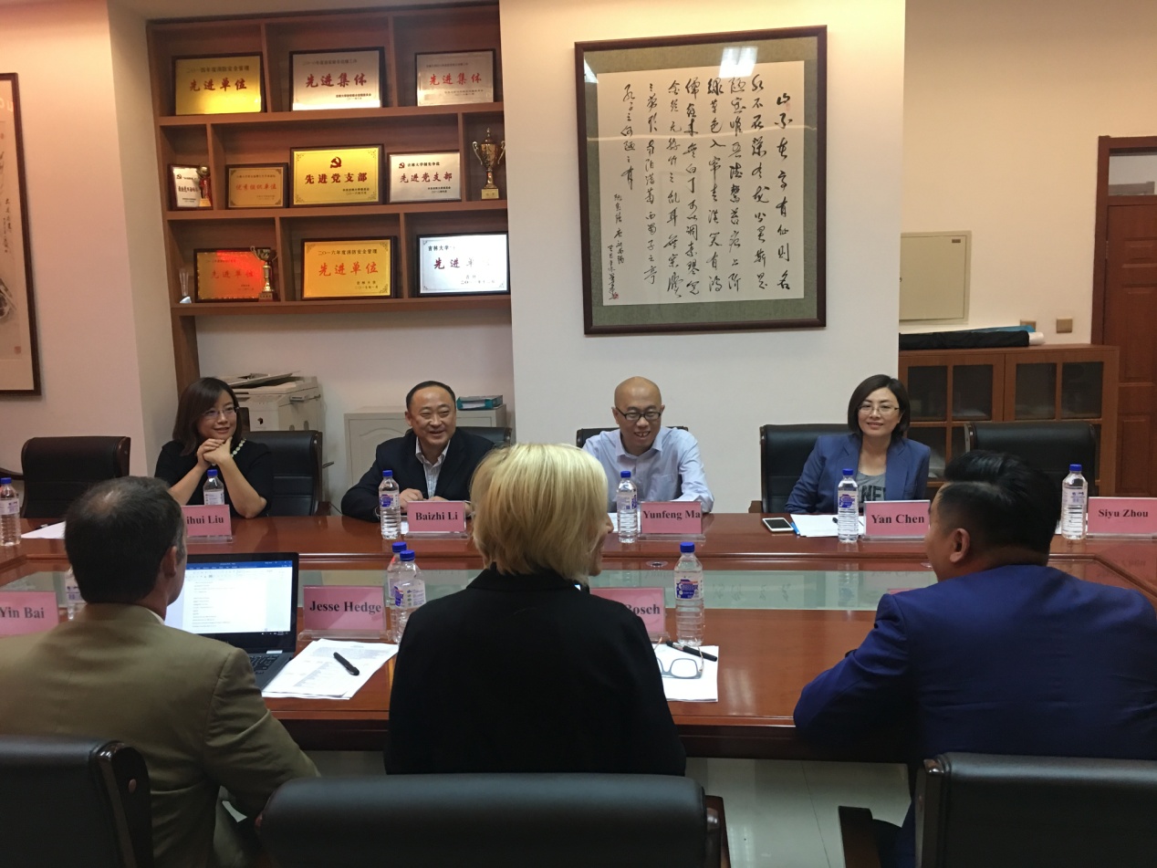 9月14日上午美国肯塔基大学文理公司本科生项目副经理安娜·博世、文理公司招生管理与决策支持副经理杰西·赫奇、文理公司国际员工项目协调员梅根·科苏尔巴及肯塔基大学驻华代表谢翔一行四人来访太阳成集团tyc,并在公司335会议室举行了座谈。生命科学公司党委书记李佰志、副经理马俊锋、副经理陈妍、副书记刘丽慧、公司国际合作与交流处综合科科长白茵等参加了会谈。 会谈中,李佰志书记首先对肯塔基大学代表团的来访表示欢迎,随后公司副经理马俊锋对太阳成集团tyc的基本情况进行了介绍,副经理陈妍向肯塔基大学代表介绍了本科生国际交流情况,并提出合作方向。肯塔基大学文理公司代表对公司的热情接待表示感谢,指出生物学科是肯塔基大学的优势学科,对与公司建立合作关系极为重视。之后双方就员工短期交流项目与2+2双学士学位项目等方面进行了商讨,就可能开展的实质性合作深入交换了意见并达成了初步的合作意向。 本次会谈开启了双方合作的大门,拓宽了公司国际交流领域,为双方进一步合作奠定了坚实的基础。