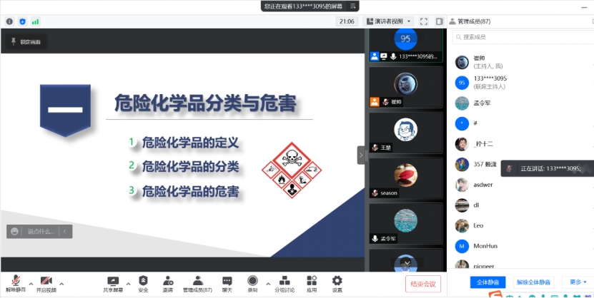 魏士刚从不同的分类方法出发全面细致的讲解了危险化学品的分类,纠正了错误的危化品分类认识,同时完善了师生的危化品分类知识,对于公司化学品全生命周期管理起到了重要的促进作用。他指出在使用化学品时可以根据官能团进行鉴别,对于会导致中毒、灼伤腐蚀以及危害环境的化学品使用时要格外注意。