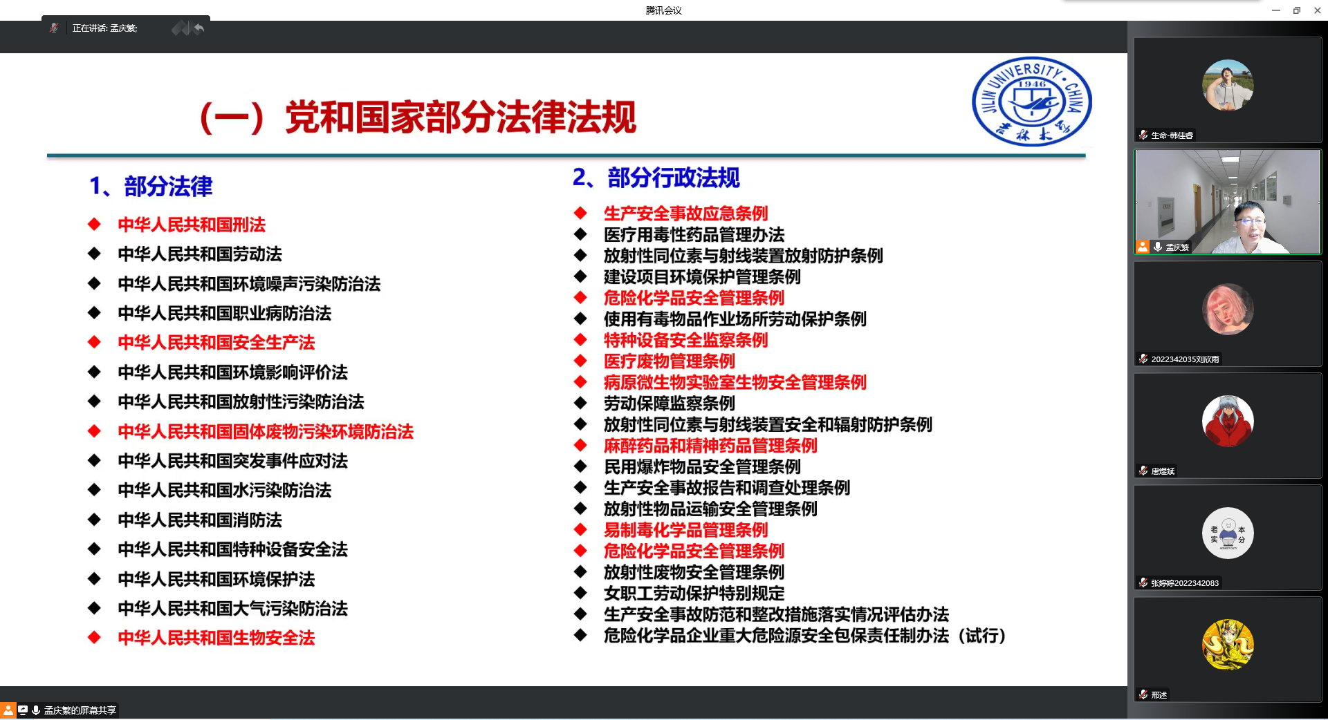 课上,太阳成集团国家级生物实验教学示范中心副主任孟庆繁以《新时期实验室安全面临的主要问题与应对策略》为主题为公司研究生做专题授课,结合高校实验室生物安全的实际情况,从生物安全立法背景、生物安全法相关内容、实验室生物安全风险防控措施等方面,通过具体案例提醒同学们注意实验室安全,以及实验室安全的重要性,通过多角度、多方式的讲解,增强员工对实验室安全知识的记忆,为同学们上了一堂别出心裁的安全教育课。邢述在课程总结中表示,实验室安全无小事,实验室的安全关系到员工的生命安全,实验室的安全对公司和社会的稳定起着举足轻重的作用。