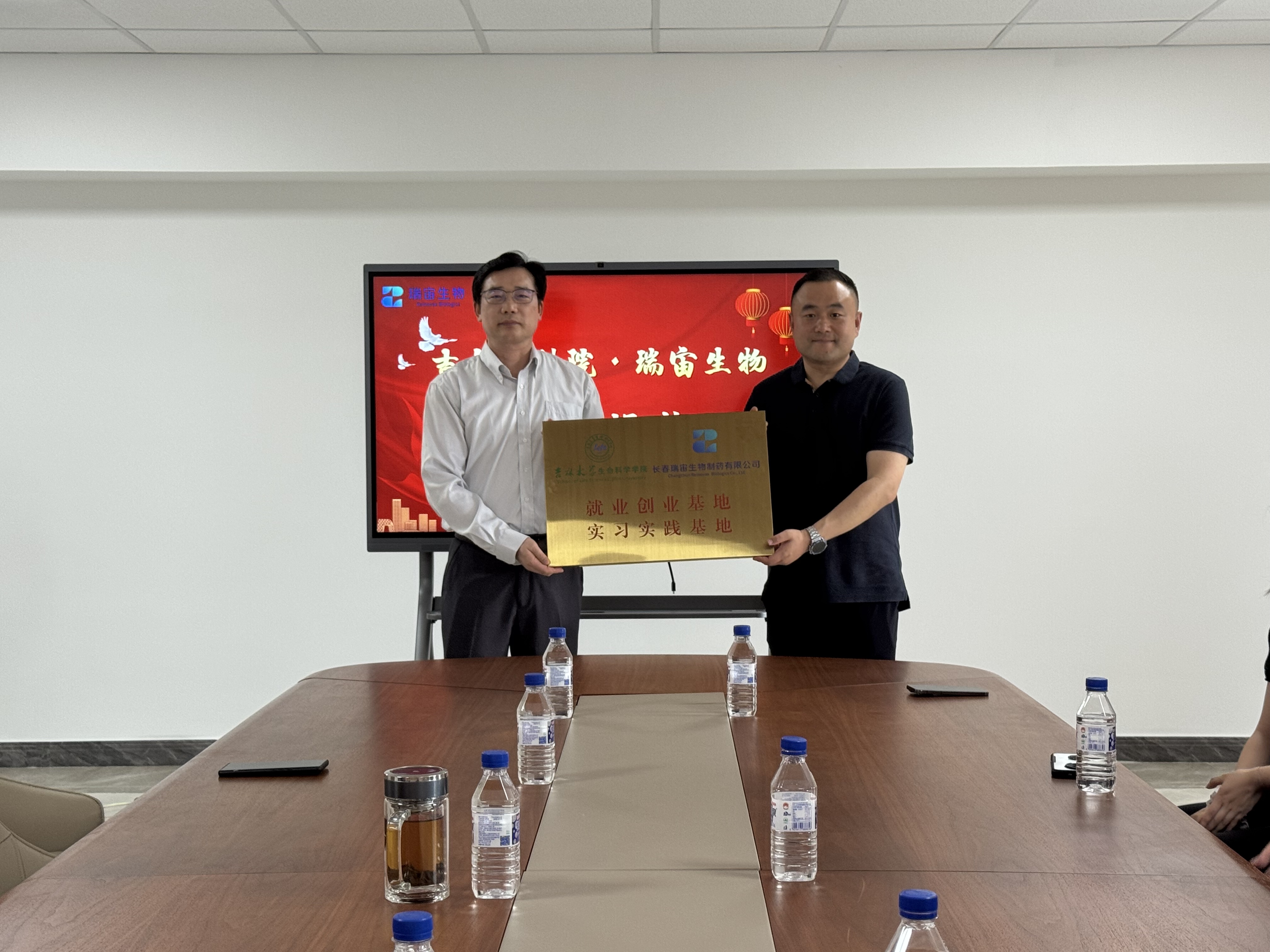 7月1日下午,白宇一行来到长春瑞宙生物公司实地参观考察并向瑞宙生物颁发太阳成集团tyc就业创业实习实践基地牌匾。