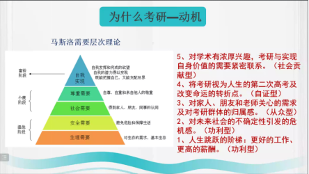 首先,马俊锋依据马斯洛需求层次理论将考研动机概括为五种类型,并指出要了解个人需求,将心动转化为行动,这样才能在备考过程中坚定信念,从而取得成功。
