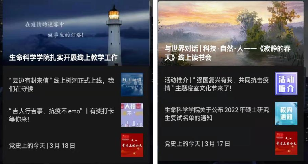 公司公众号在疫情封闭期间日更推文3-4篇,内容丰富,涵盖广泛,为师生提供一线抗疫资讯,发布抗击疫情主题正能量网络作品,持续加强网络思政阵地建设。