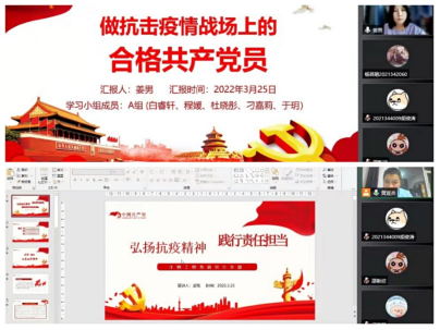 接着进入支部成员讲微党课环节。姜男以“做抗击疫情战场的合格共产党员”为题,从疫情战场对党员的要求、做疫情战场的合格党员、在防控中争当合格党员、守初心打赢疫情防控战四个方面分享了体会。孟瑶结合习近平总书记在全国抗击新冠肺炎疫情表彰大会上的重要讲话精神,以“弘扬抗疫精神,践行责任担当”为主题,从弘扬抗疫精神、学习先进典型、发挥党员先锋模范作用三个方面进行交流。两位同学的微党课不仅坚定了大家克服困难的信心,也激励大家积极行动起来,在抗击疫情中践行共产党员的初心使命和责任担当。