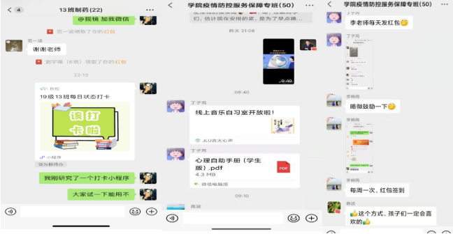 为加强全面疏导和精准指导,全体班主任与学工队伍不断创新工作方法,积极回应员工关切、解决员工诉求,通过专业化的心理辅导、亲情化的思想关怀、常态化的教育引领,引导员工平和心态、阳光战“疫”。结合重要时间节点,通过组织主题班会、小组会议,谈心谈话等形式,就员工关心的考研、保研、就业、毕业设计等问题进行逐一回应,为员工答疑解惑、排忧解难;通过自制接龙小程序、组建学习小组、开展线上打卡、撰写抗疫日记等方式,引导员工缓解紧张情绪、合理规划时间,加强体育运动和自我管理。
