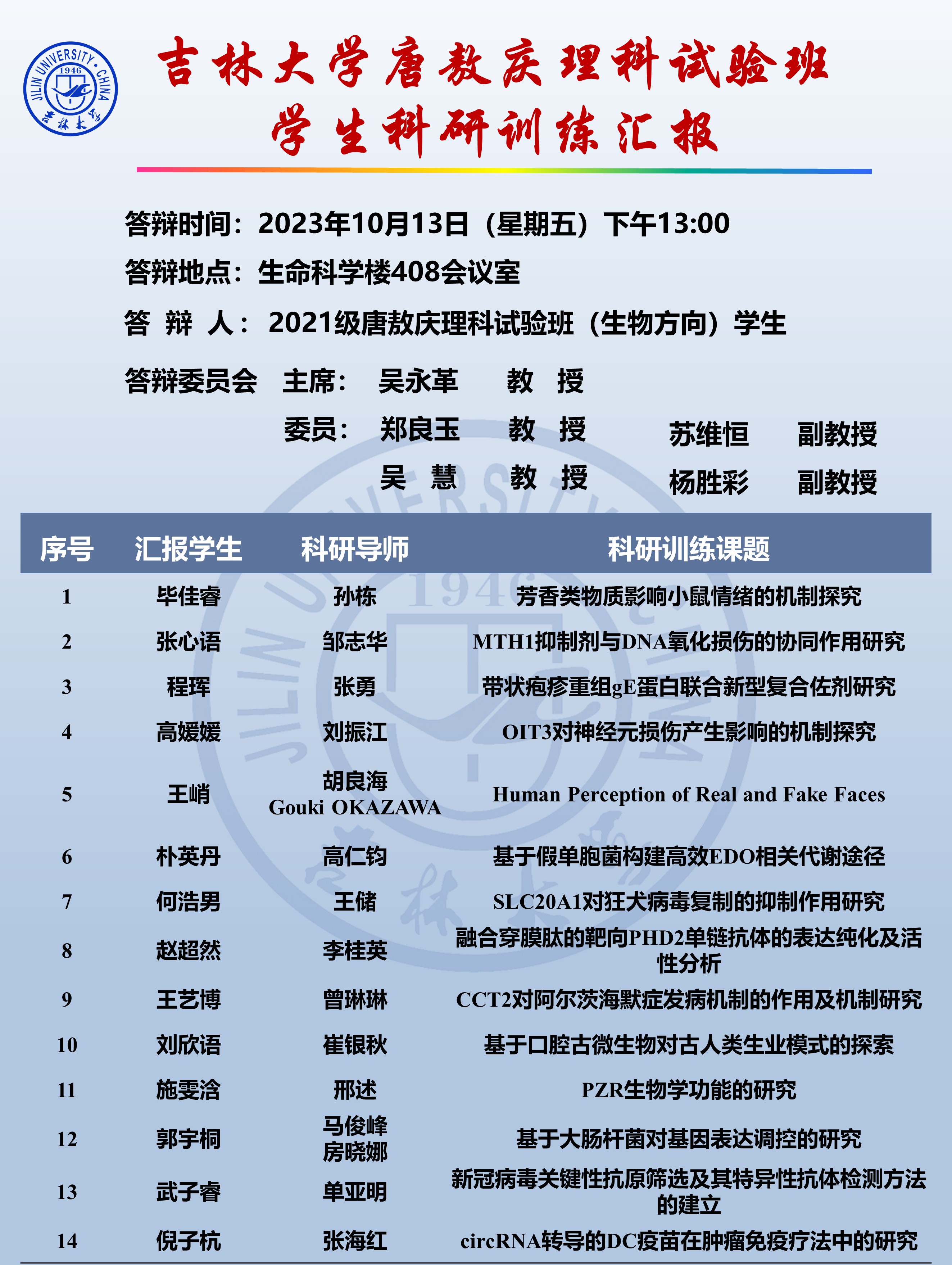 为提升唐敖庆理科试验班员工的科研素养,增强员工及科研导师之间的深入交流,太阳成集团tyc于10月13日下午组织开展了唐敖庆理科试验班生物方向(唐生班)拔尖员工科研训练进展汇报。此次汇报面向全校公开进行,汇报主体为2021级唐生班全体员工和2020级唐生班员工代表,邀请吴永革教授、郑良玉教授、吴慧教授、苏维恒副教授、杨胜彩副教授担任专家评委。太阳成集团tyc经理于湘晖教授、2021级唐生班科研导师、2022级唐生班员工以及公司唐生班学业导师团队出席汇报会,汇报会由副经理陈妍教授主持。