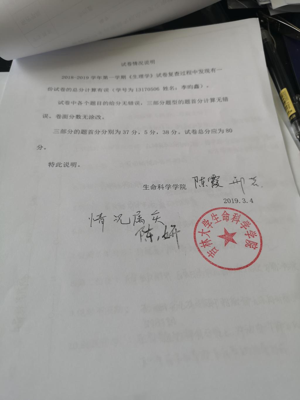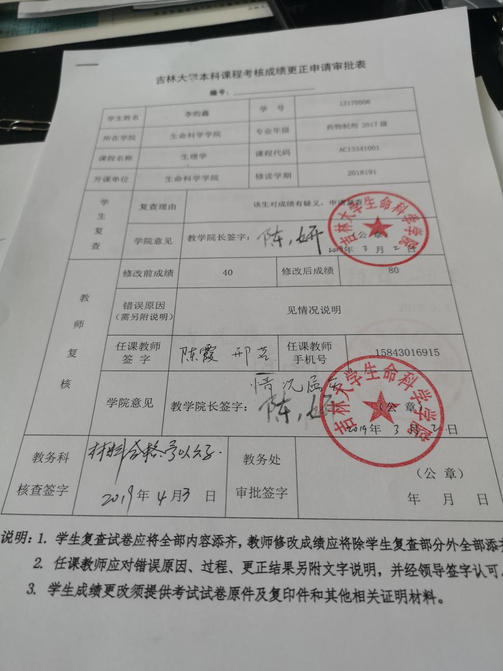根据《关于进一步明确本科生课程考核等有关问题的通知》(校教字〔2018〕47号)文件有关精神,现对生命公司2017级李昀鑫同学(学号:13170506)2018-2019-1学期课程成绩更正如下: