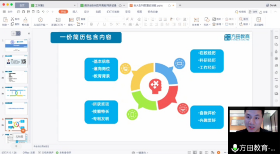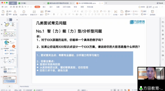 2021年5月12日晚19点,公司联合方田教育举办“一路同行就业季系列活动(五)——方田教育人力总监为你面试添砖加瓦”活动,由方田教育人力总监在腾讯会议在线为大家进行就业面试技巧培训,公司党委副书记林相友、崔帅及本院毕业年级员工及有相关需求的同学参会。