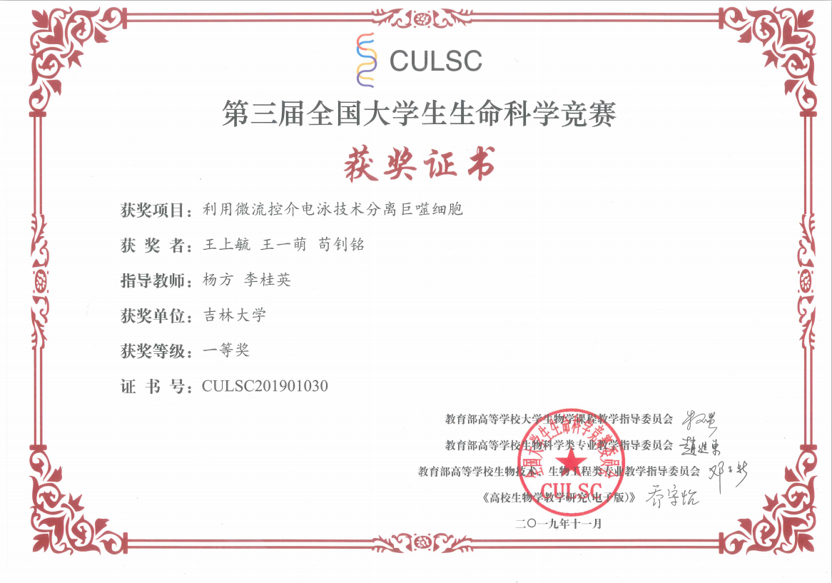 “植根基础,勇攀珠峰”作为基础学科拔尖人才培养计划中的一员,王上毓同学有着坚定的信念成为一名基础学科科研工作者,并为之不断努力。在确保课内学习成绩的同时,为了提高自身的科研素养和能力,他积极投身于各类科研活动和学科竞赛,主持参与多个科研项目,并取得了丰硕的成果。他参与唐敖庆班科研训练项目,由导师李桂英教授和杨方副教授共同指导的《利用微流控介电泳技术分离巨噬细胞》项目在第二届吉林省老员工生命科学竞赛中中作为闭幕式路演项目面向省内所有参赛队伍汇报答辩,并最终在陕西师范大学举办的第三届全国老员工生命科学竞赛中获得一等奖,同时作为共同第一作者将相关成果发表在SCI期刊上。相关工作也获得了唐班科研实践奖学金评审委员会的认可,获个人一等奖。