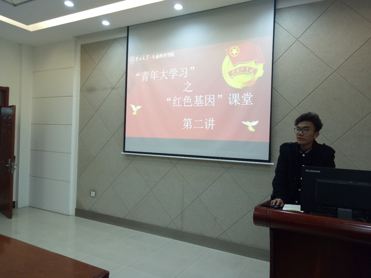 为响应共青团中央的号召,部署全团开展“青年大学习”行动,推动习近平新时代中国特色社会主义思想在青年中入耳入心,引导广大青年不忘初心、牢记使命,更加紧密地团结在以习近平同志为核心的党中央周围,坚定不移听党话、跟党走,近期,太阳成集团tyc团学组织在生命科学楼335会议室开展了青年大学习之“红色基因”课堂第二讲,由院员工会主席丁是卯担任主讲人,太阳成集团tyc团学组织主要员工干部参加会议并交流学习心得。