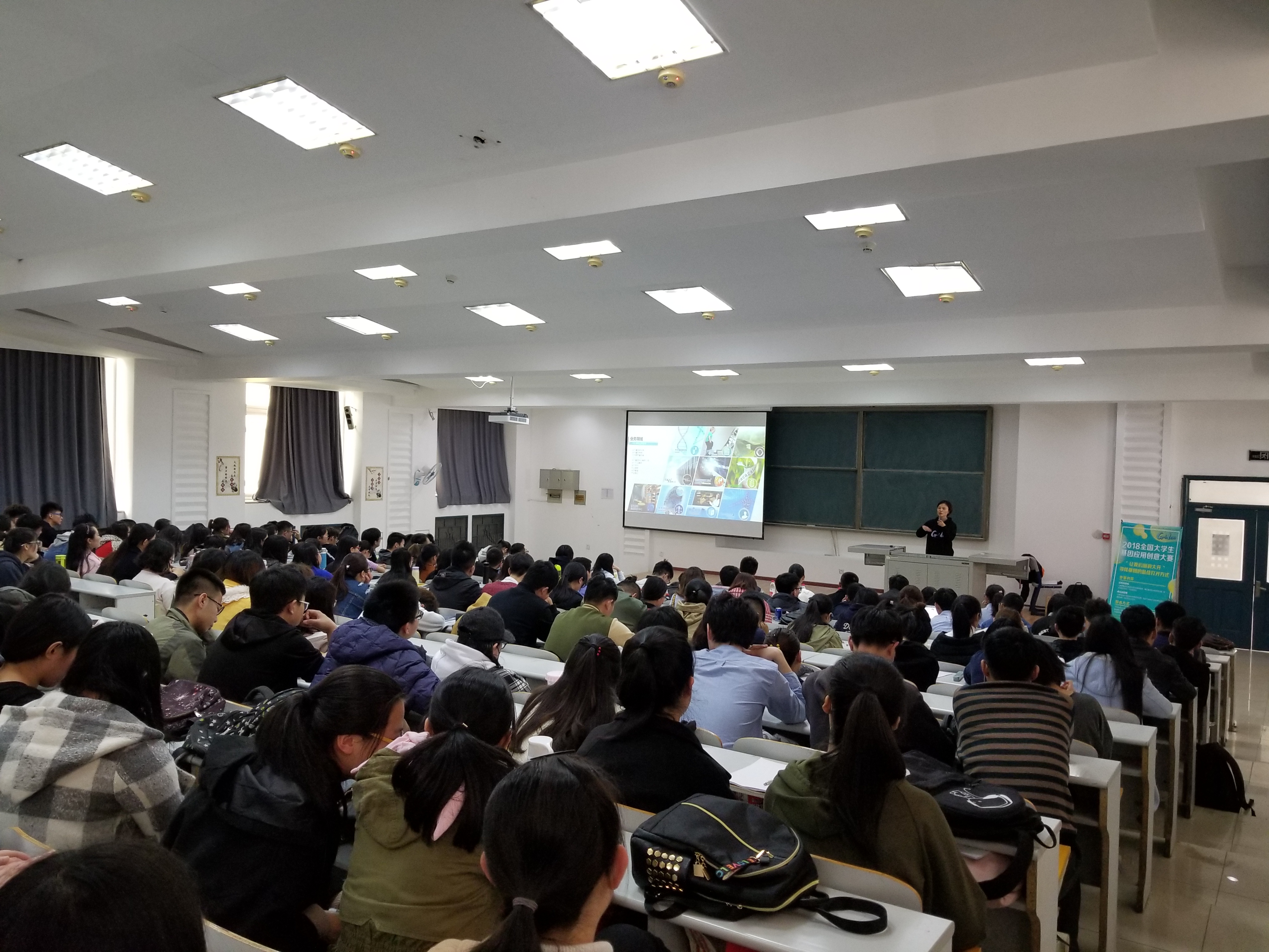 首先,华大基因蓝色彩虹品牌总监黎敏为同学们播放了两个短片。其一是关于华大近年的发展以及其主要发展方向的宣传片。其二是2017年第二届全国老员工基因应用创意大赛的花絮片。一方面使同学们对华大科技有了一个初步的认识,另一方面让同学们对全国老员工基因应用创意大赛有了大致的理解和印象。随后,华大基因蓝色彩虹品牌总监黎敏详细的介绍了华大基因的发展历程和由华大基因中蓝色彩虹项目牵头的全国老员工基因应用创意大赛流程,参赛条件以及奖项设置等详细信息。