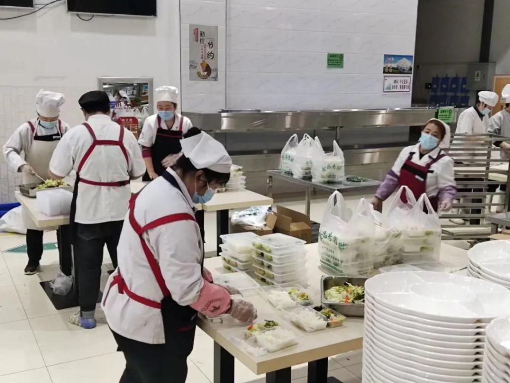 “同志们,由于疫情形势严峻,公司采取寝室封闭管理,我们要帮助后勤部门解决大家吃早饭的问题,公司需要我们的时候到了,希望大家全力以赴,守护我们的校园……”简单的介绍情况后,齐鹏老师为我们找来了防护用品,在一一检查了大家的穿戴情况后,我们每20人一个小组,分配到各个餐厅开展工作。