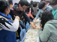 联欢晚会以一支欢快的《小苹果》舞蹈作为开场,现场气氛立即活跃起来。晚会高潮是包饺子大赛,所有研究生同学分为四个组参赛,以规定时间内各组包饺子的数量多少和形状美感裁决胜负。比赛期间,同学们大显身手,在短暂的时间内包出了麦穗饺子、蝴蝶饺子等创意精致、花样繁多的饺子。比赛结束后,同学们一边品尝着大家齐心协力亲手制作的饺子,一边观看多才多艺的同学们自告奋勇表演的精彩节目。随后,大家又参与了有奖问答和“心有灵犀喂你吃”“漂洋过海来看你”等互动游戏。联欢晚会全程中,同学们都互相协作,团结一心,各个环节有序进行,整体氛围其乐融融,欢声笑语充满了整间屋子,温馨之意弥漫在每人心间。