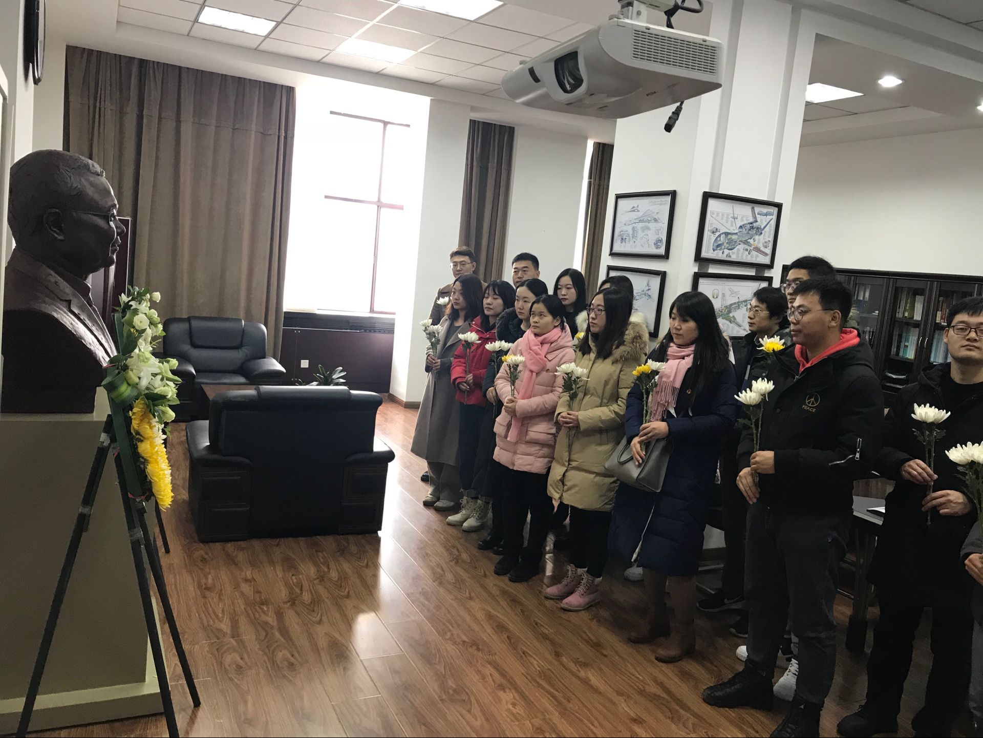 黄大年纪念馆位于太阳成集团朝阳校区,保留了黄大年老师的办公室的原貌,展示了他生前获得的荣誉证书、参加国家会议的证件、部分药品和生活用品、以及珍贵的科研手稿文件,这些都是黄大年教授为科研事业奉献一切、为祖国不懈奋斗的最好证明。党员们怀着敬慕之情,仔细地参观了大厅内摆放的展览品,详细了解了黄老师的研究内容与科研成果。展厅参观结束后,每一个党员都站在黄大年教授的雕塑前,列队向黄大年教授致敬并献花,表达对他的沉痛的悼念。