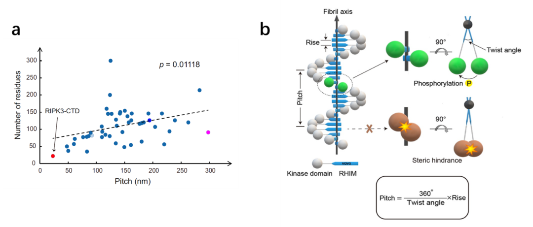RIPK3-CTD 纤维的迷你S型结构有别与目前所有已知的病理性淀粉样纤维结构。其纤维具有最小的纤维螺旋周期,在沿RIPK3-CTD纤维轴排布的临近两层RIPK3分子之间的螺旋转角为所有已知结构纤维中最大的(图2)。这种排布方式可以有效的避免其N端激酶结构域在纤维自组装过程中的空间位阻限制,并能调控其在纤维结构中更高效地进行分子间磷酸化反应,高效介导信号的级联放大与胞内传递。