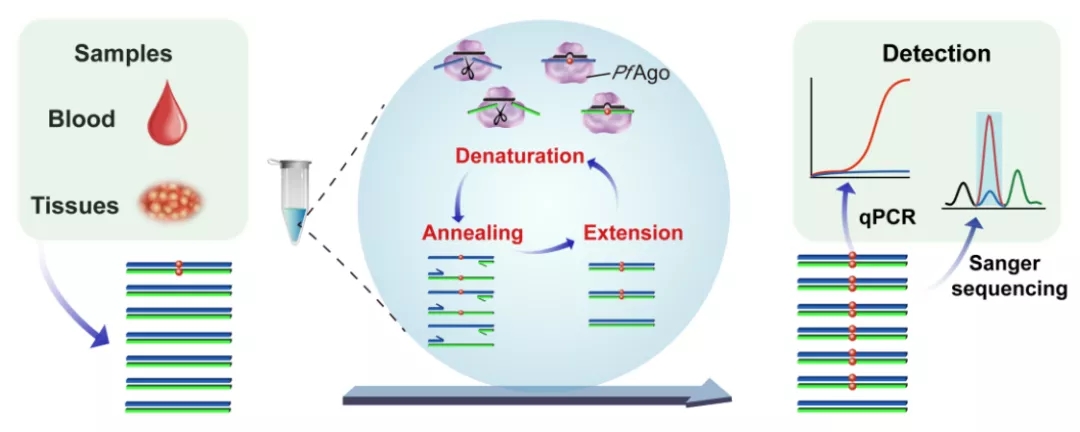 在这项研究中,研究人员开发的低丰度SNV核酸富集技术整合了高温Argonaute蛋白的多个优良特性,包括高温稳定性、可编程性、对任意靶标核酸的精准剪切、特异性识别SNV靶标核酸、多重正交反应检测多重靶标。具体来说,研究人员首先通过对嗜热菌Argonaute酶学特性研究,筛选高温稳定及高效核酸酶活性的Argonaute蛋白,得到可与PCR扩增反应兼容的核酸酶PfAgo(Pyrococcus furiosus Argonaute)。接着揭示了PfAgo在DNA引导链介导下的精准剪切特性,巧妙的通过引导链错配设计,实现了对靶标核酸的单碱基区分,并建立了PfAgo-PCR偶联体系。该“一管式”反应体系可以实现PfAgo在PCR变性步骤(94 ℃)选择性剪切野生型基因,保留的突变基因可在PCR退火(~58 ℃)、延伸(~72 ℃)步骤中得以循环扩增,实现低丰度突变基因的超高效率富集和精准检测。富集样品可兼容Sanger测序、qPCR等多终端检测。