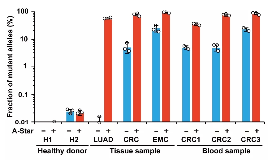 对血液和实体瘤组织等复杂样品进行测试,证实A-Star可以高特异性和敏感性检测高背景DNA临床样本。