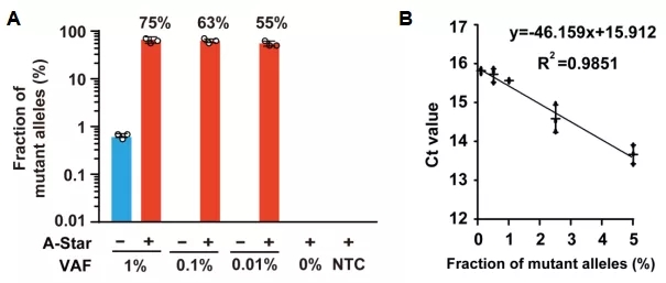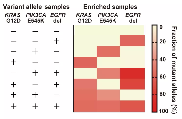 研究人员测试了A-Star对KRAS、PIK3CA和EGFR等多个肿瘤突变基因的富集效果,证实A-Star能够轻松检测和定量0.01%的稀有突变,富集效率高达5,500倍。