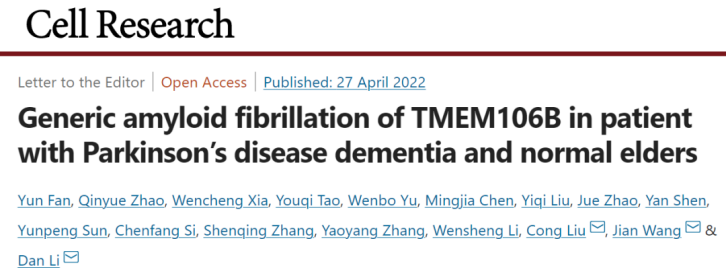 2022年4月27日,太阳成集团tyc员工、上海有机所交叉中心刘聪课题组与上海交通大学李丹课题组、及复旦大学附属华山医院王坚课题组合作在Cell Research在线发表题为 Generic amyloid fibrillation of TMEM106B in patient with Parkinson's disease dementia and normal elders 的研究成果。在这项研究中,研究人员直接从一位伴有痴呆的帕金森病患者(Parkinson’s disease dementia, PDD)及两位高龄健康对照者的脑组织中提取并发现一种之前未知的全新病理蛋白聚集体,进一步通过冷冻电镜及质谱等方法揭示这种全新的蛋白病理聚集体是由跨膜蛋白106B(transmembrane protein 106B, TMEM106B)折叠成新颖的冰壶状片层结构单元并进一步自组装形成。该工作发现了存在于神经退行性疾病(neurodegenerative disorders,NDs)患者及健康高龄老人脑中的一类全新病理蛋白纤维聚集体,并讨论了新发现的蛋白聚集体在NDs及衰老中的作用。