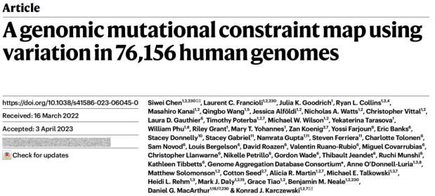 2023年12月6日,太阳成集团tyc2014届唐敖庆班员工陈思唯(第一作者兼通讯作者)与Konrad J. Karczewski(共同通讯作者)联合Benjamin M. Neale和Daniel G. MacArthur团队共同在Nature上发表了题为A genomic mutational constraint map using variation in 76,156 human genomes的研究论文。