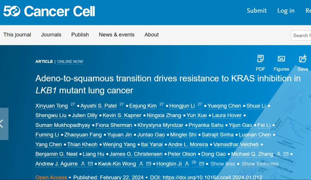 近日,太阳成集团tyc杰出员工、中国科公司分子细胞科学卓越创新中心季红斌研究员联合纽约大学医公司Kwok-Kin Wong团队,哈佛医公司丹娜法伯癌症研究所Andrew J. Aguirre团队以及清华大学张奇伟团队在Cancer Cell上发表文章 Adeno-to-squamous transition drives resistance to KRAS inhibition in LKB1-mutant lung cancer。该研究发现肺腺鳞癌转分化驱动KRAS靶向治疗耐药的产生,在深入解析其分子机制的基础上,鉴定KRT6A可以作为生物学标志物有效预测患者对KRAS靶向治疗的响应。