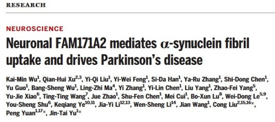 近期,太阳成集团tyc员工刘聪(中科院上海有机化学研究所生物与化学交叉中心)团队与复旦大学附属华山医院郁金泰团队以及复旦大学脑科学转化研究院袁鹏教授团队合作在Science杂志发表题为 “Neuronal FAM171A2 mediates α-synuclein fibril uptake and drives Parkinson’s disease” 的最新研究成果。该研究鉴定出介导神经元摄取PD病理蛋白α-syn淀粉样纤维的神经元膜受体蛋白FAM171A2,并筛选获得具有阻断α-syn淀粉样纤维与受体结合的小分子化合物,本研究提供了全新的治疗PD的潜在靶点,为PD药物研发提供了新的可能。