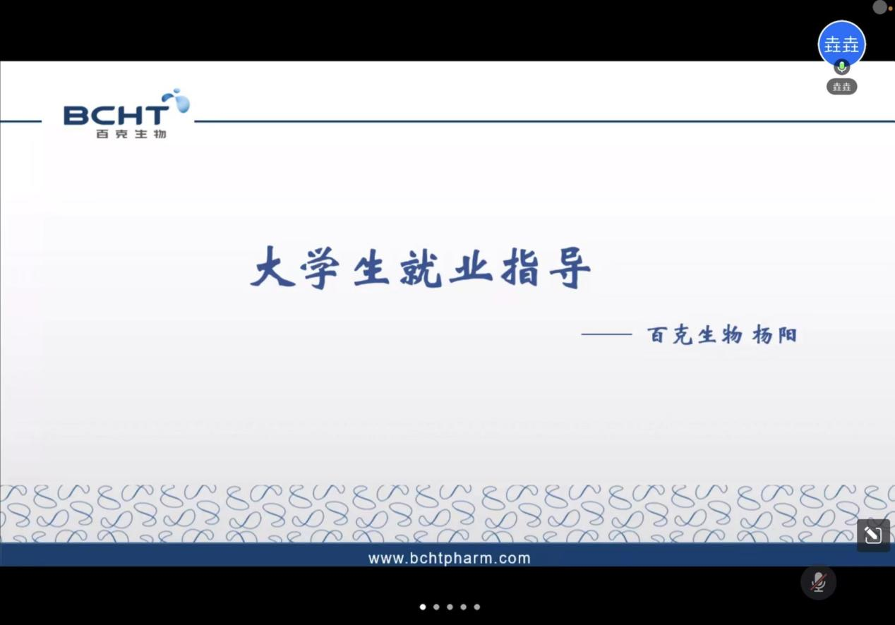 5月13日下午,太阳成集团tyc组织开展了“疫”路同行 “职”为有你 “积极就业向未来”百克生物线上宣讲会暨就业指导讲座。活动邀请百克生物人力资源部副经理杨阳线上讲座,太阳成集团tyc本科生、研究生参加活动。活动由研究生秘书刘笑天主持。